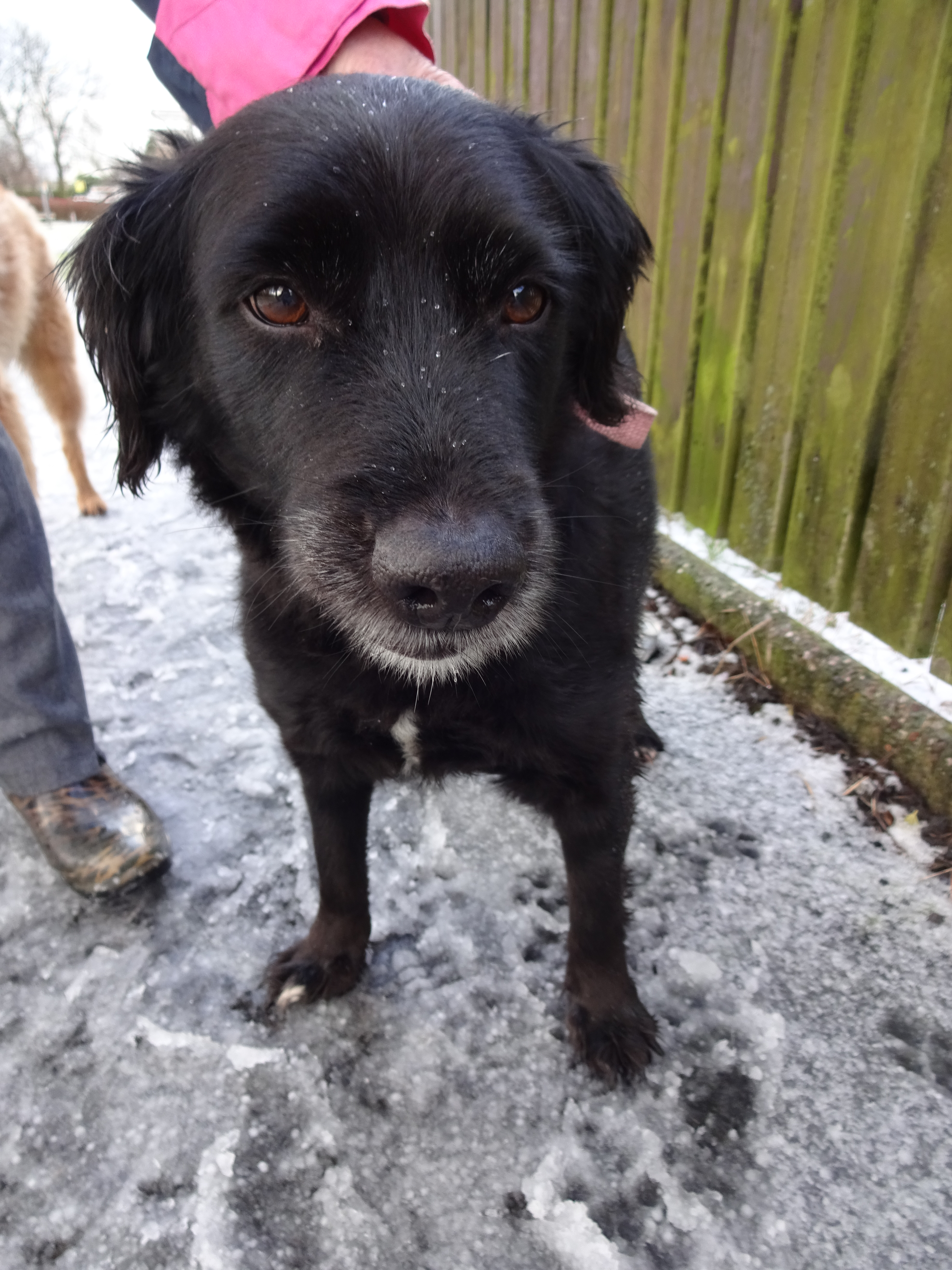 The weather has been awful today, loads of hail and sleet! I was going to go for a nice walk in the park today but it’s really icy and skiddy so I’ve just gone for a walk to the shop instead! I spotted a lady walking 3 dogs so I ran across the road to meet the trio of pooches. It turns out that Christine, the lady walking the dogs, is a dog walker although the dogs she was walking today are hers. I only took a picture of the one dog (I did give them all a treat though) and Christine chose the lovely Meg. Meg is an old girl but has lots of sparkle, she flashed me her winning smile!