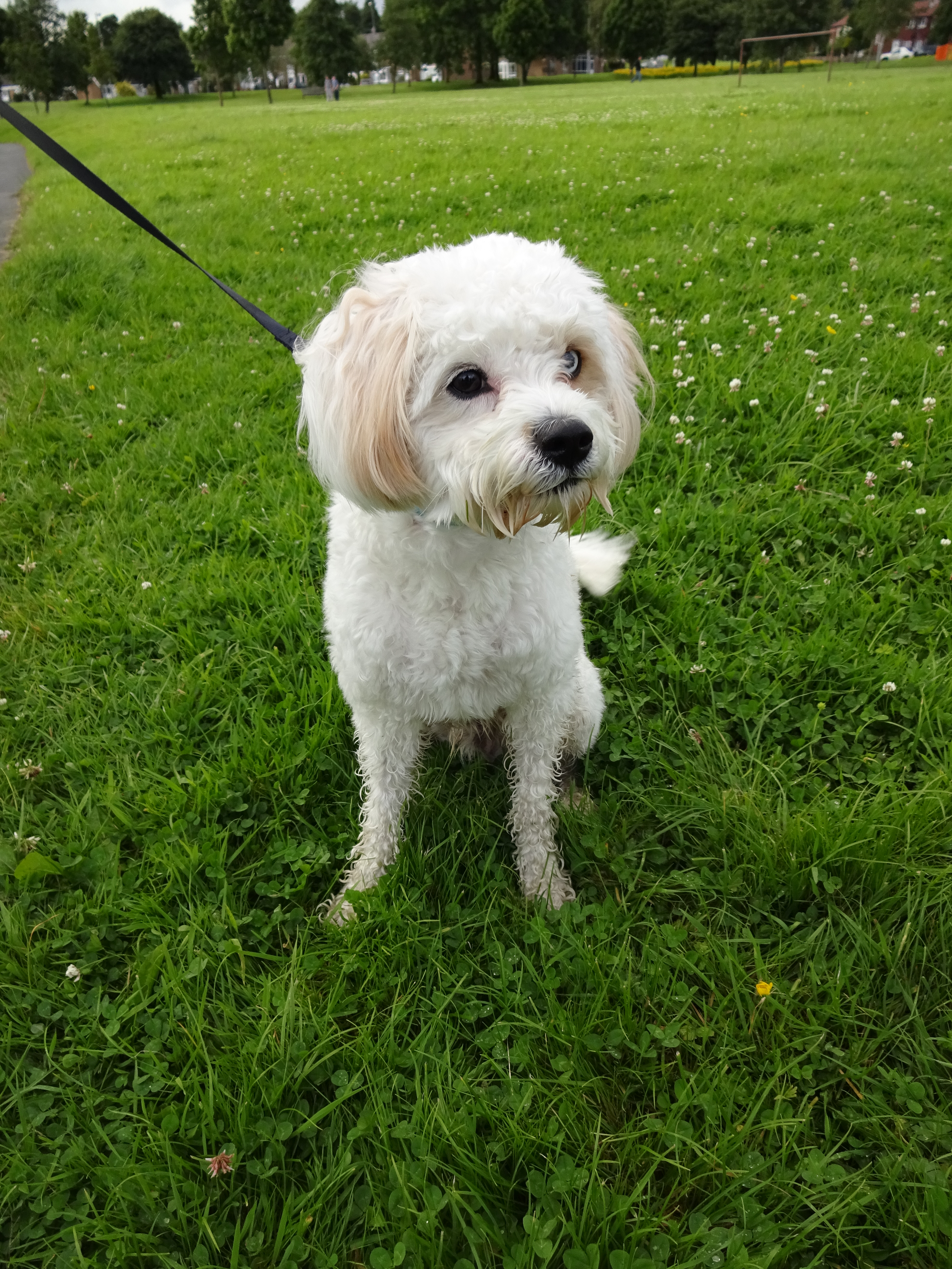 It’s been raining loads again today so I didn’t get out at lunchtime. I had to wait for my husband to get back from work before I went out in search for a dog, fortunately I managed to get a break in the rain. I walked to a park and spotted a family walking a really cute, happy looking dog. Oscar is a lovely Cavachon, he’s a really friendly boy and gave me a little kiss! Oscar has two different colour eyes, one brown and one blue, he looks very cool, he’s like David Bowie! His eye colour meant that some people weren’t interested in him but fortunately his family fell in love with him; they wanted an extra member for their family, it doesn’t matter what colour his eyes are! Oscar has two human sisters, they all love each other very much!