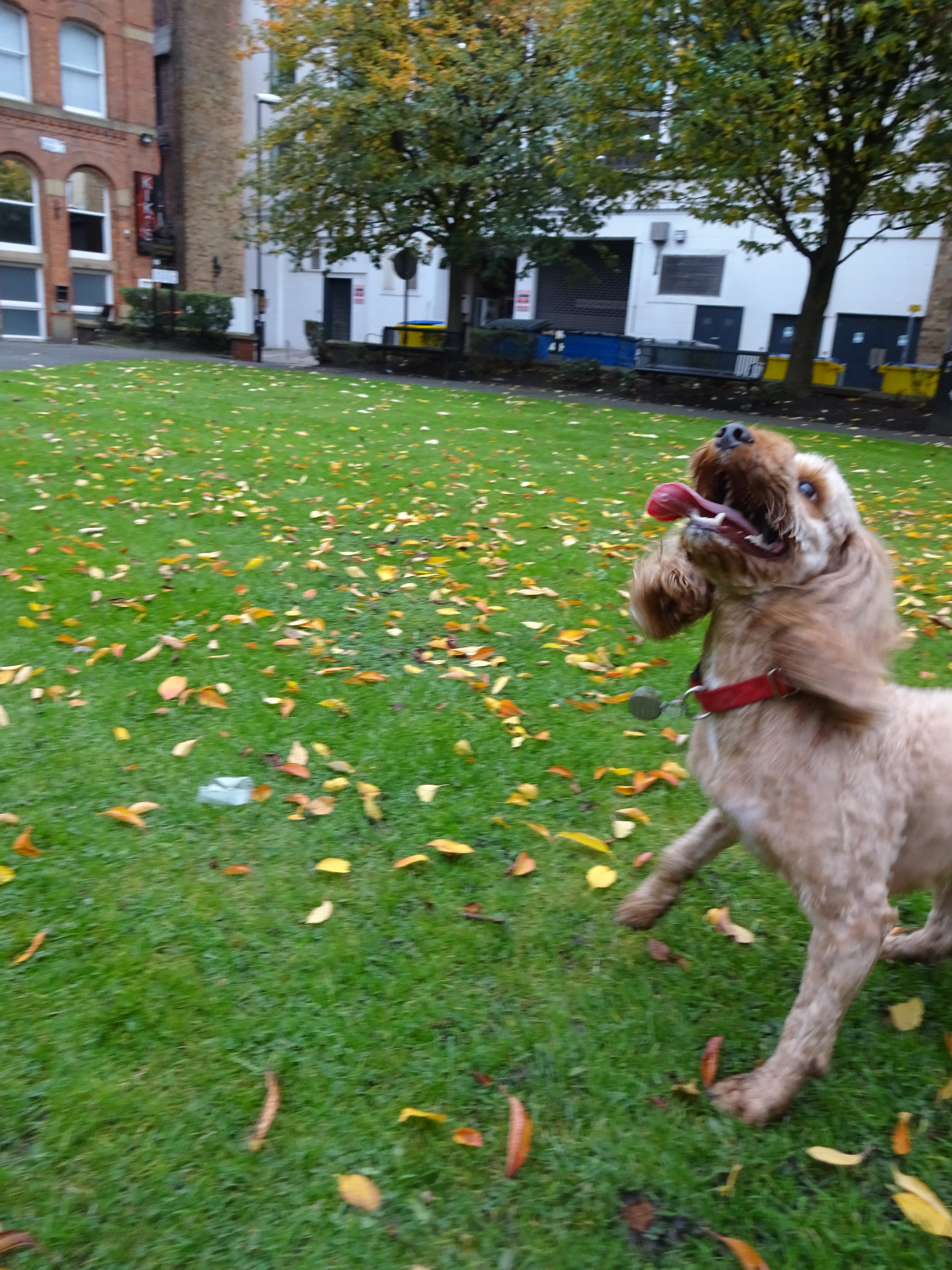 I’m working late again today and with the dark nights I felt the pressure to find a dog during the daytime. I went for a little walk to a small park in the centre of Manchester at lunchtime and I was in luck, there was a couple with 2 dogs there! I went over to say hello to Honey and Ollie. Ollie is a rescue dog and isn’t very keen on strangers so I asked if Honey could be my dog of the day! Honey is a very excited girl, even though she had a tennis ball in her mouth for most of the time I was with her I could still see that she had a big smile! Honey isn’t too keen on having her picture taken though so it took quite a while to get a decent shot! She’s a very clever girl and kept running behind her mum when she saw the camera! I did mange to get a picture of her though which I was glad about, she’s very cute! I also got to give her a little stroke once I’d put my camera away!