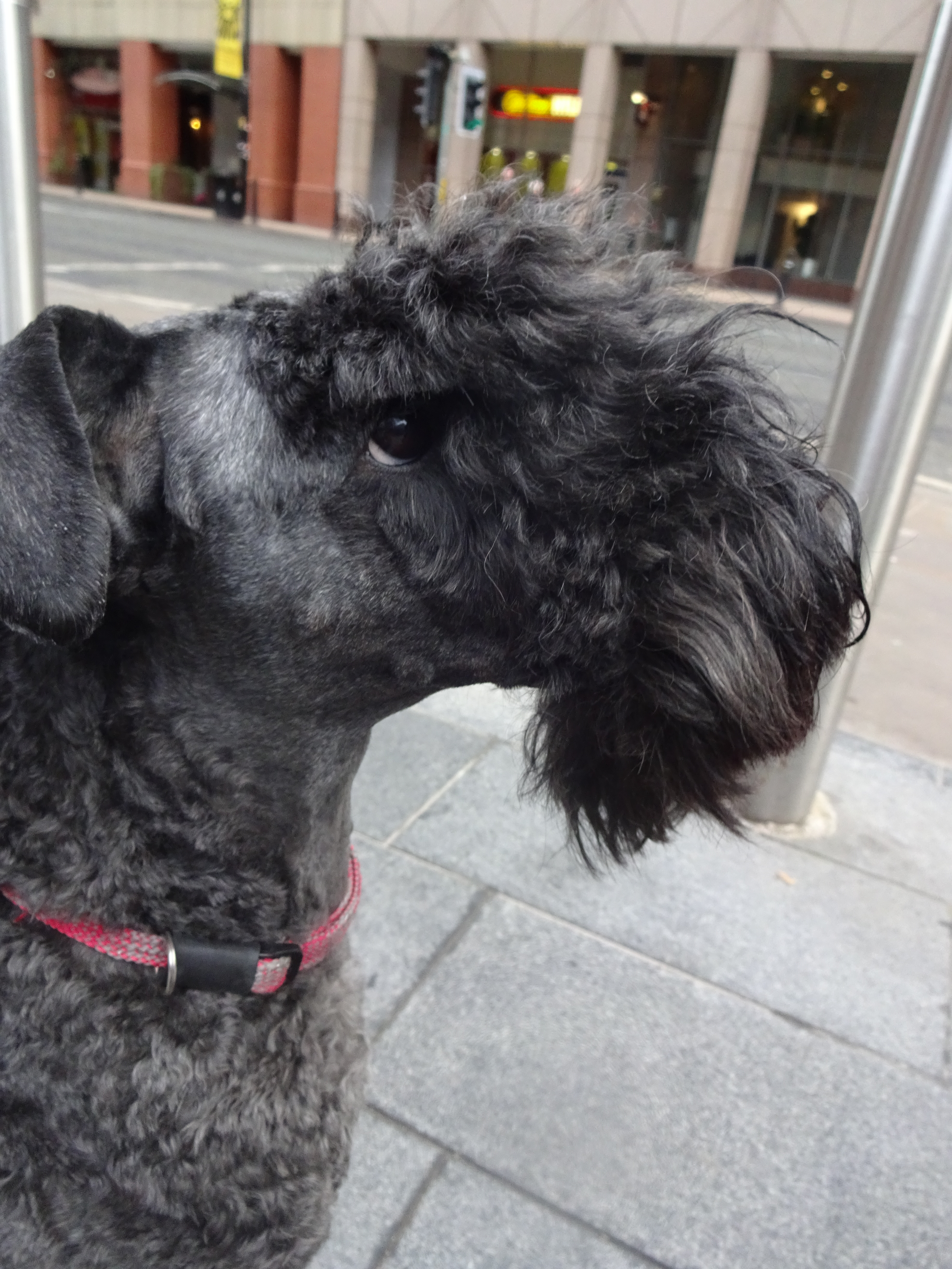 I went for a lunchtime today, I was pleased it wasn’t raining! I walked down Deansgate and I was really surprised when I spotted a very handsome Kerry Blue Terrier who wasn’t one of the ones I’ve seen before! Murphey is now the 4th Kerry Blue I’ve met this year and all of them have been in central Manchester; what are the odds! Murphey is a really friendly boy, he gave me lots of kisses! Murphey would like to be friends with the whole world, he said hello to all the passers by. He’s also a very chatty boy!