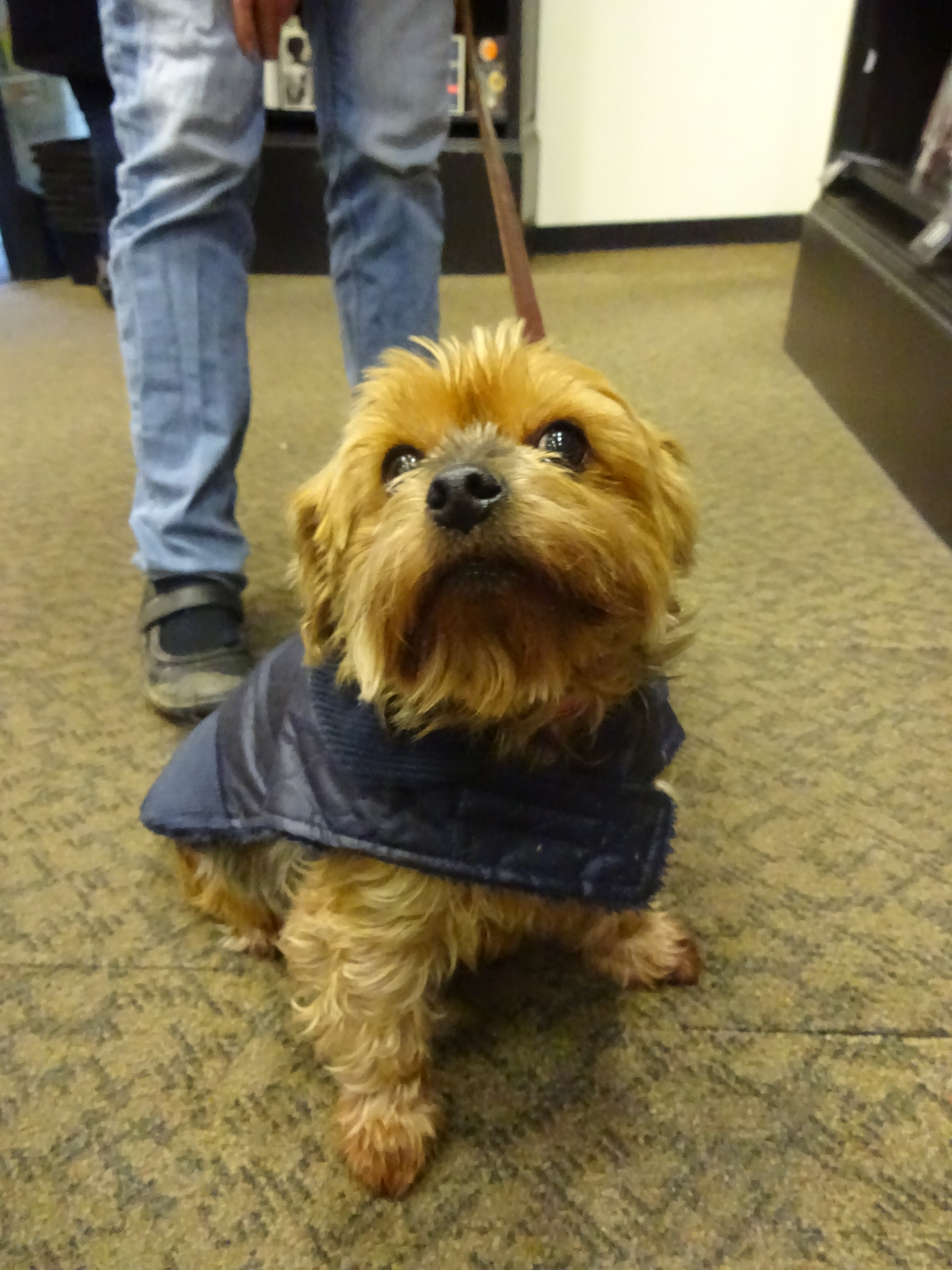 The weather has been terrible today! It was raining at lunchtime so I decided to wait until the rain stopped before I went in search of a dog. Fortunately there was a break in the rain so I went for a little walk. I didn’t have to go very far down Deansgate when I spotted a lady carrying a really cute Yorkshire Terrier so I went to say hello. Stanley is a really friendly boy, as soon as I gave him a stroke he started hugging my hand; he didn’t want to let go, so cute! Stanley’s human mummy told me that he walks on two legs nearly all of the time, he’s been doing it since he was a puppy; I didn’t get to see it though! Stanley was on a day trip with his human mummy and her friend; Stanley is from Hull. Stanley likes to go travelling with his mummy and he’s a VIP member of the East Yorkshire Coach Services, he even gets sent his own newsletters!